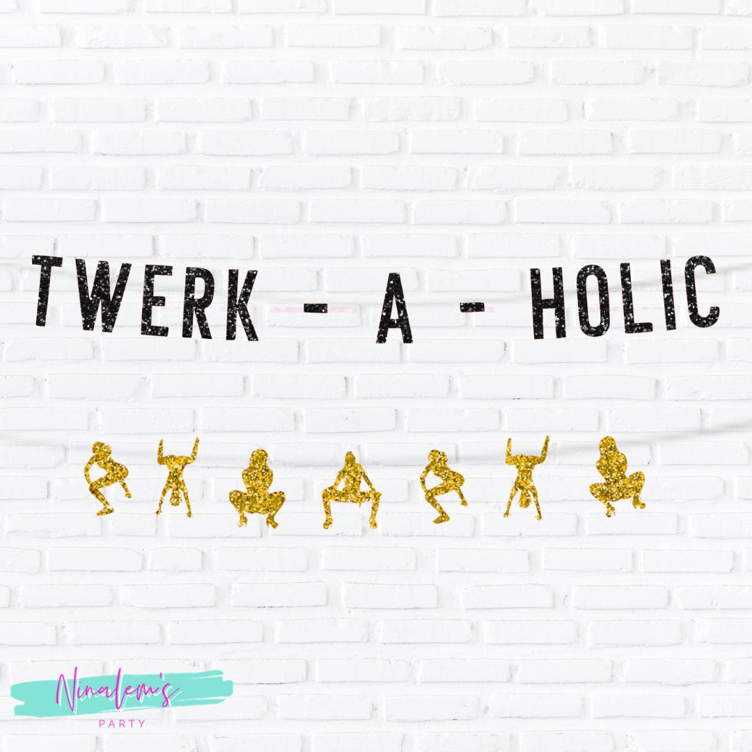 Available in over 20 different colors. Text color shown is black glitter. Please choose your text color from the drop down menu. The twerkers are shown in gold glitter. If you would like different color twerkers, please let us know in the "notes to seller" section at checkout. Otherwise we will send as shown in gold glitter. The banner will be glitter on the from side and white on the back