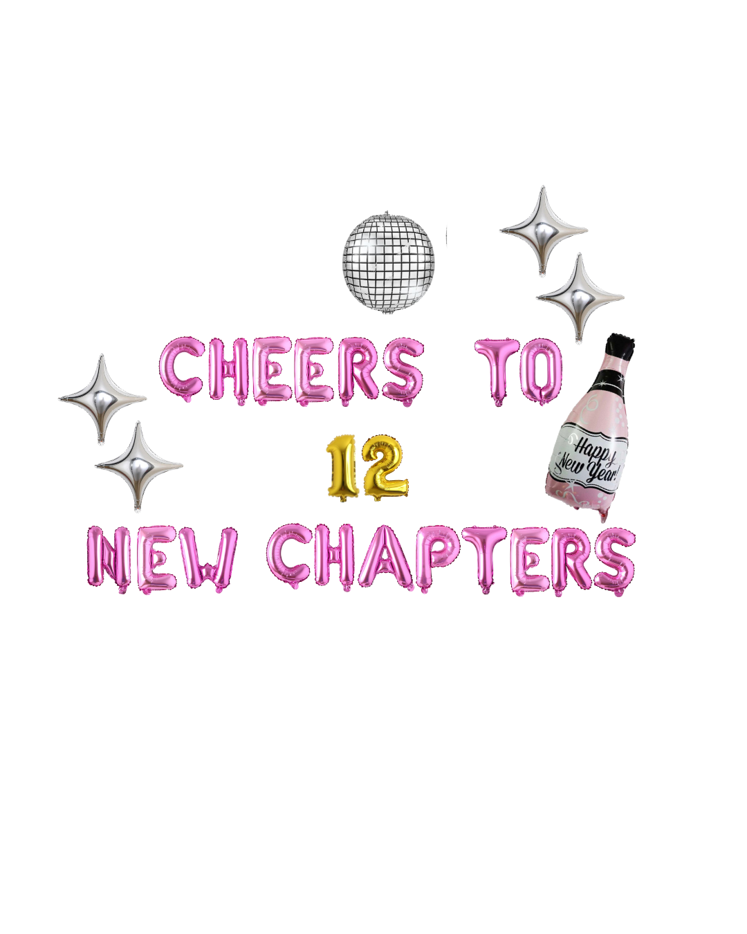 This Listing is for ONE (1) "Cheers To 12 New Chapters" balloon banner as shown. Perfect for your New Years Eve party!